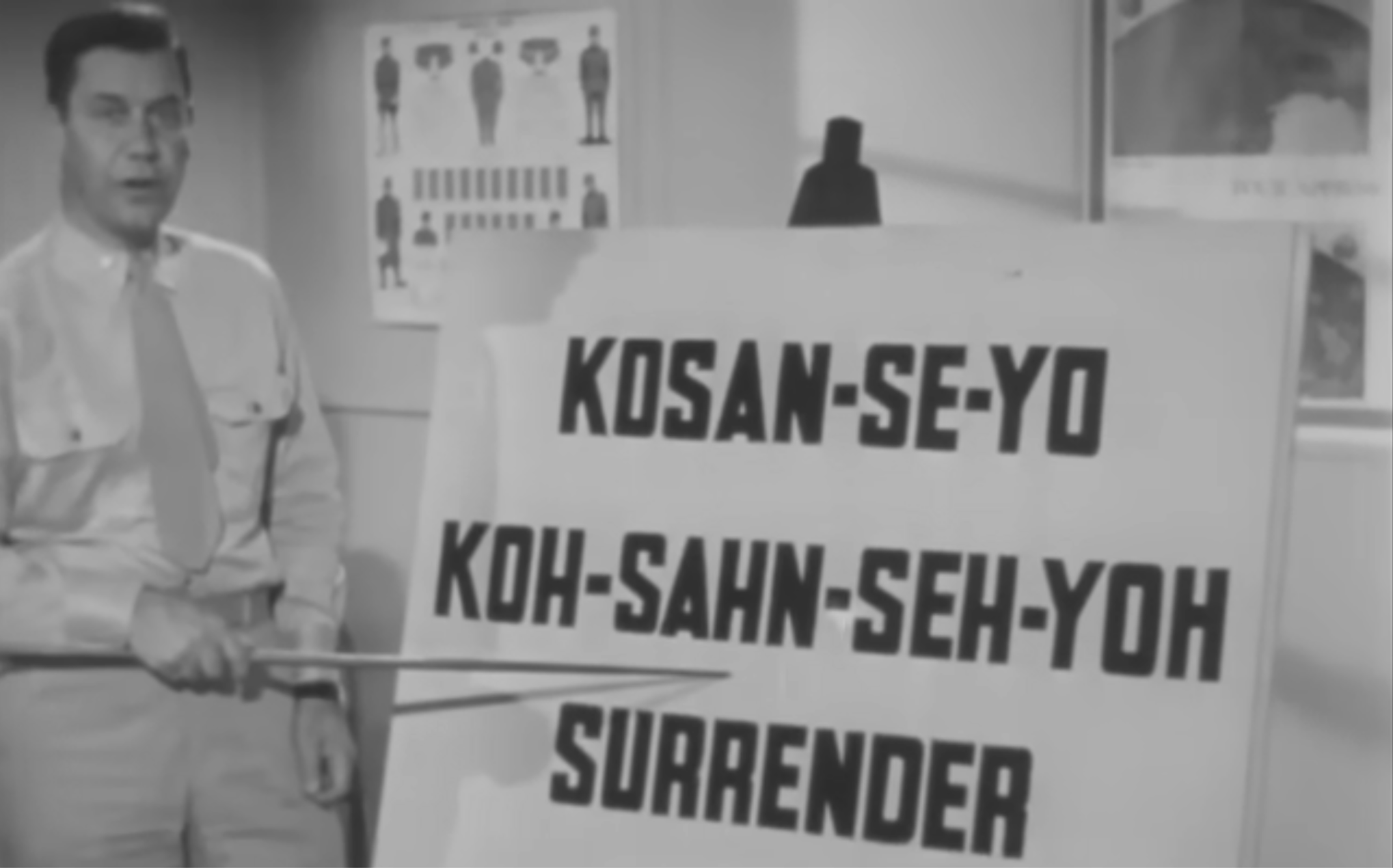 In this WWII-era video from the US Marine Corps, you learn how to say phrases like “surrender”, “drop your weapons”, and “we won’t murder you” in Japanese. In just ten minutes, you can learn some key terms for capturing Axis POWs. The video is complete with call and response portions, so you too can practice your new Japanese words. At one point, the instructor tells us: “Get these Japanese words down pat. It takes time, it takes trouble, but it also takes prisoners.” He closes the video with, “Remember: words, too, are weapons”.